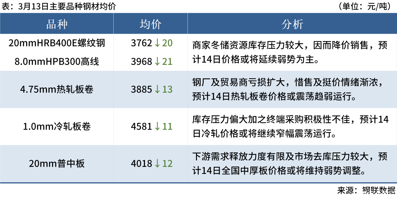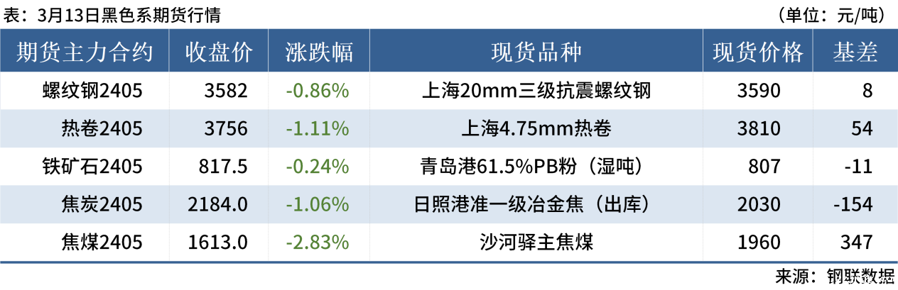 ◎ 3月13日,全国主港铁矿石成交36.00万吨,环比减54%;237家主流贸易商建筑钢材成交9.87万吨,环比减23.8%。
