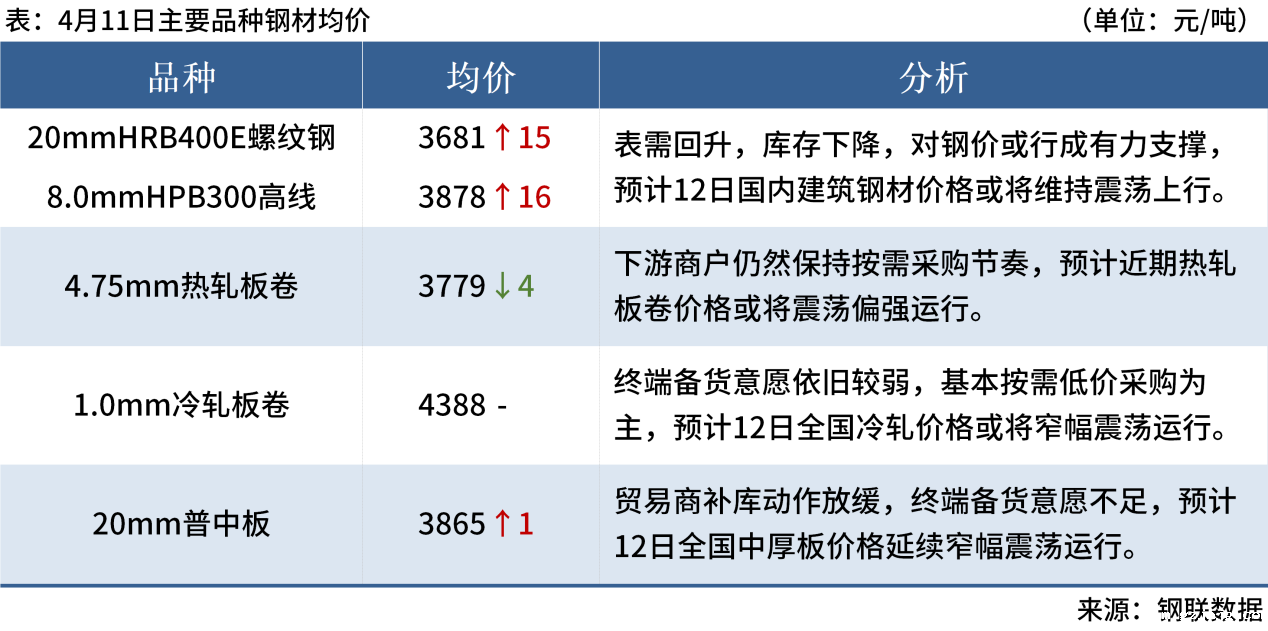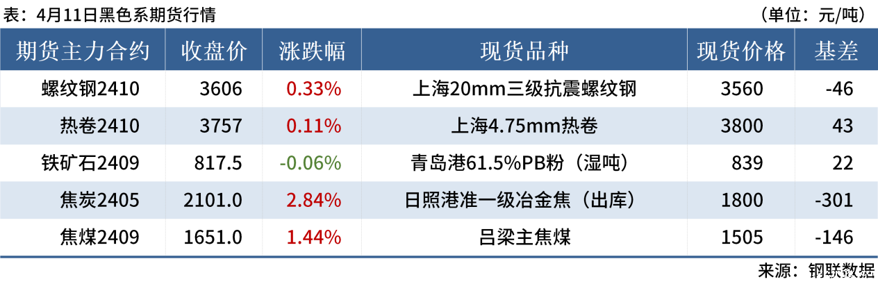 ◎ 4月11日,全国主港铁矿石成交67.20万吨,环比减36.8%;237家主流贸易商建筑钢材成交18.35万吨,环比增42.8%。