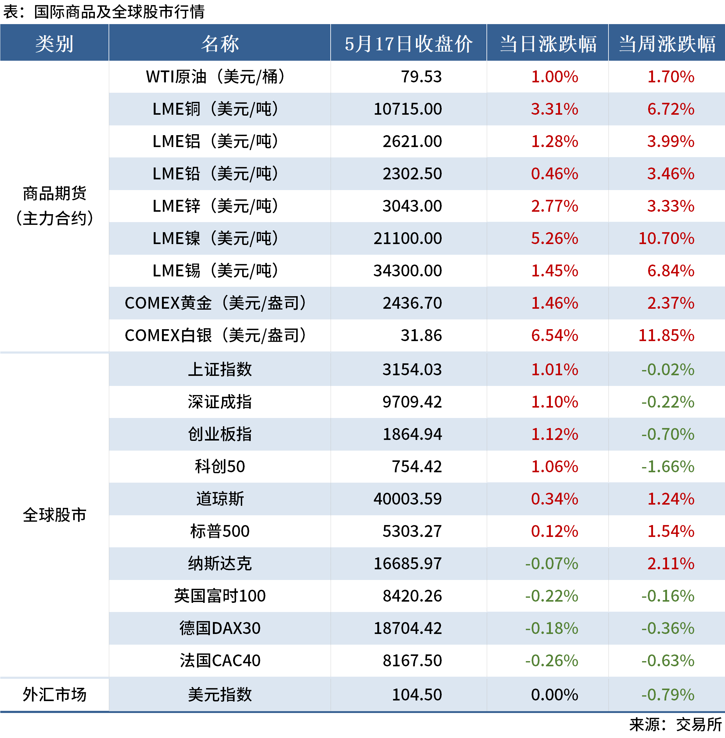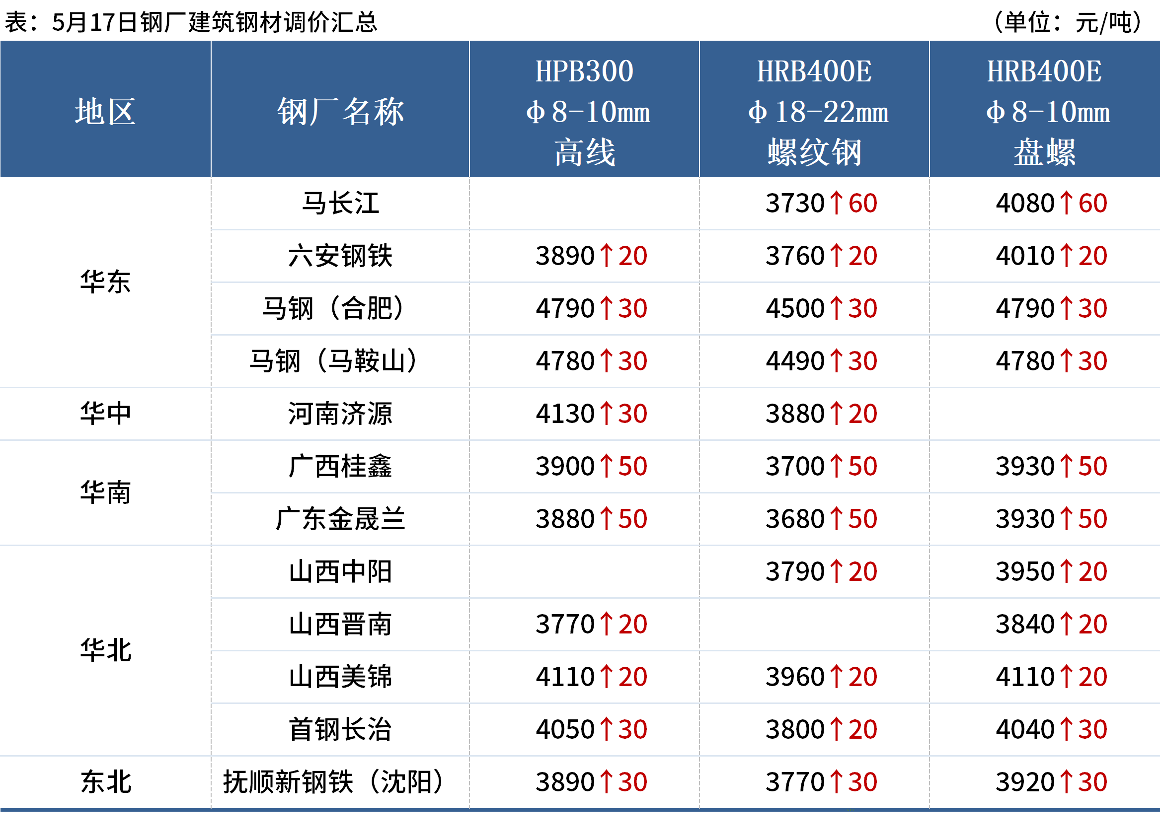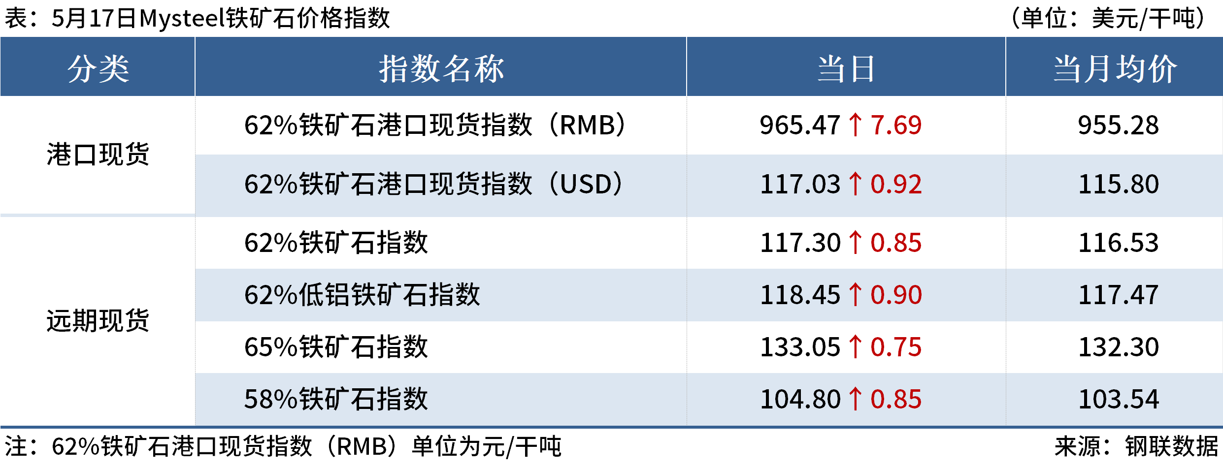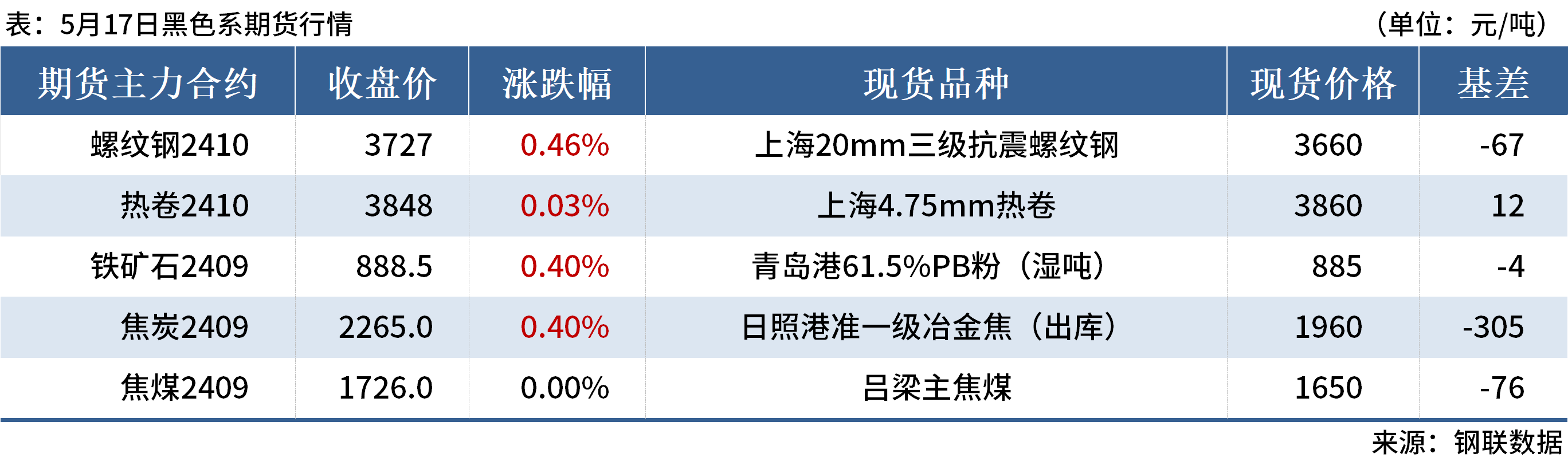 ◎5月17日,全国主港铁矿石成交69.30万吨,环比减22.1%;237家主流贸易商建筑钢材成交14.30万吨,环比减15.7%。