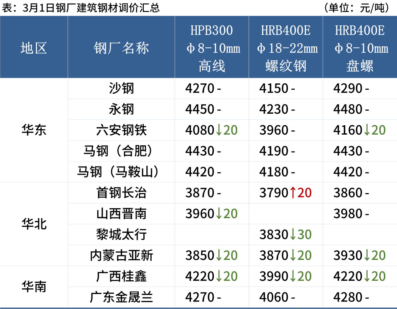 3月1日,5家钢厂建筑钢材出厂价格下调20-30元/吨,1家上调20元/吨
