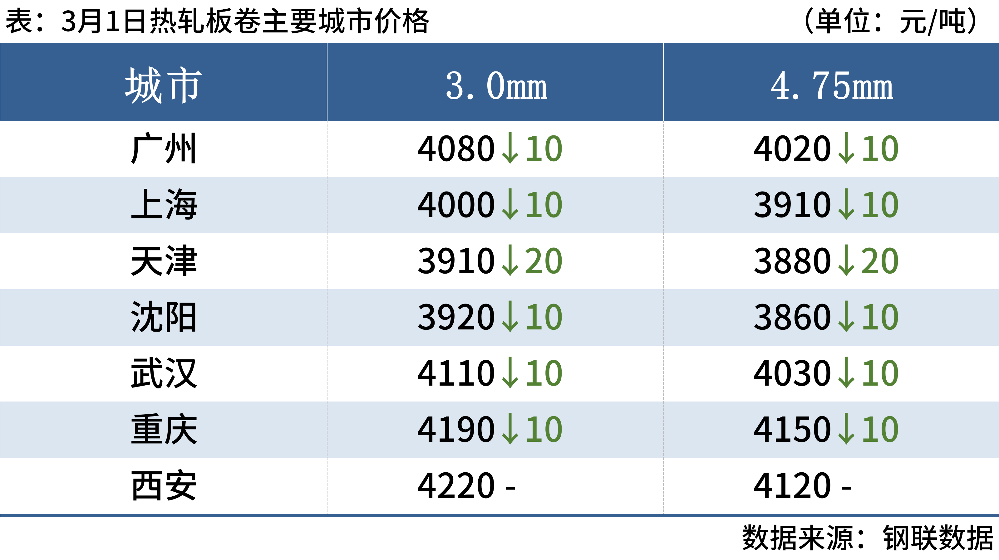 热轧板卷:3月1日,全国24个主要城市4.75mm热轧板卷均价4038元/吨,较上个交易日下跌7元/吨。供应方面,原料端依旧走势较弱,钢厂供应端产量下降,但全国的库存仍然在累积。贸易商整体心态较差,库存压力逐渐呈现。下游需求端并未有良好的复苏迹象。也许是由于盘面近期走势较弱,导致下游观望情绪较浓。整个基本面来看,短期上是供强需弱的,但一旦下游需求集中爆发,库存将会快速去化,预计近期热轧板卷价格或将震荡运行。