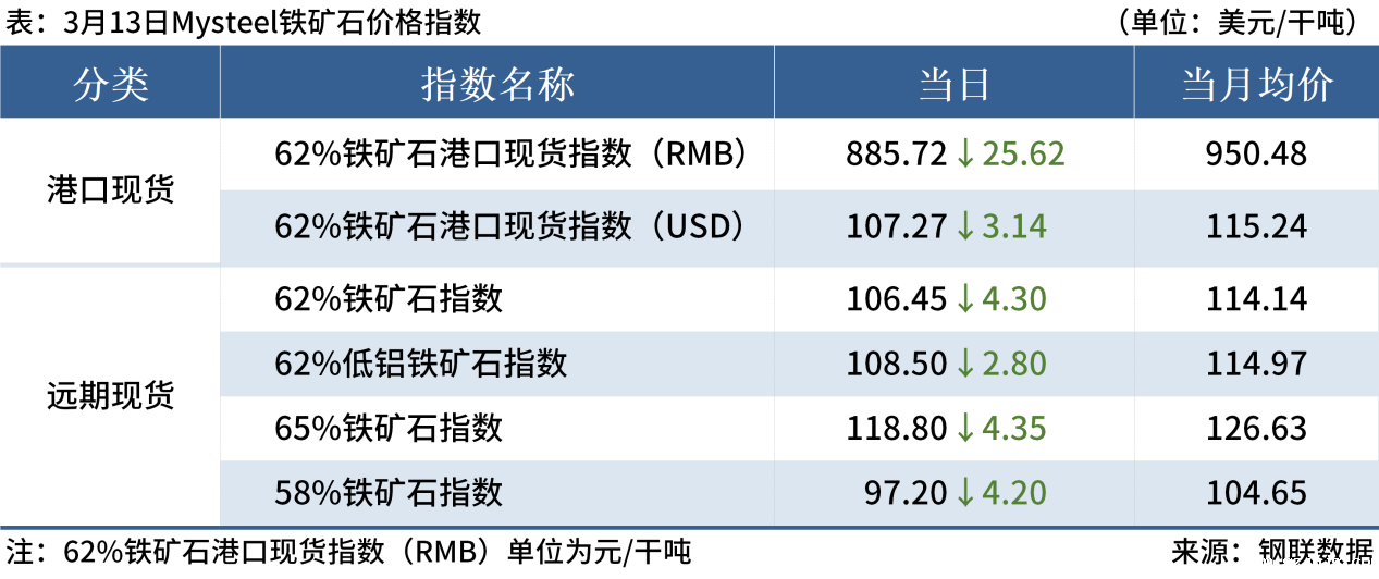 ◎ 3月13日Mysteel 62%铁矿石指数106.45跌4.3,月均114.14;65%铁矿石指数118.8跌4.35,月均126.63。(单位:美元/干吨)