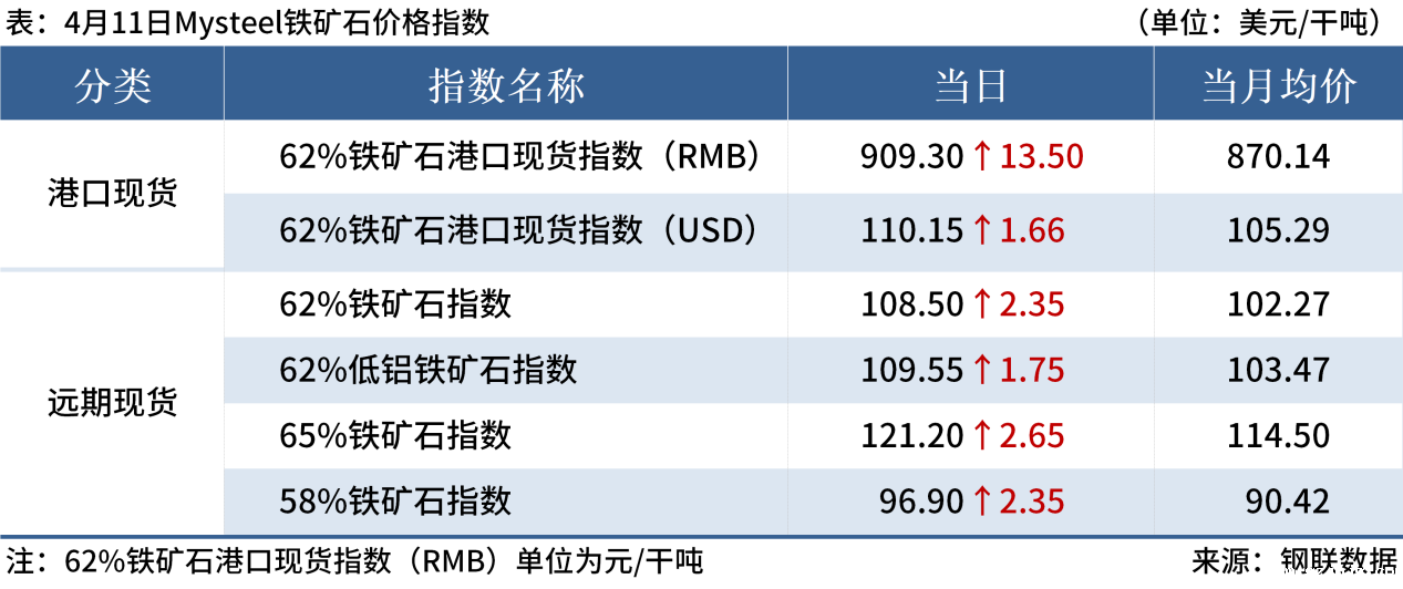 ◎ 4月11日,全国主港铁矿石成交67.20万吨,环比减36.8%;237家主流贸易商建筑钢材成交18.35万吨,环比增42.8%。