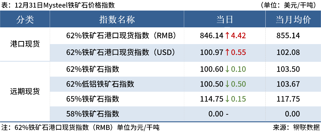 ◎12月31日,全国主港铁矿石成交92.69万吨,环比增9.7%;237家主流贸易商建筑钢材成交8.99万吨,环比减24.9%。